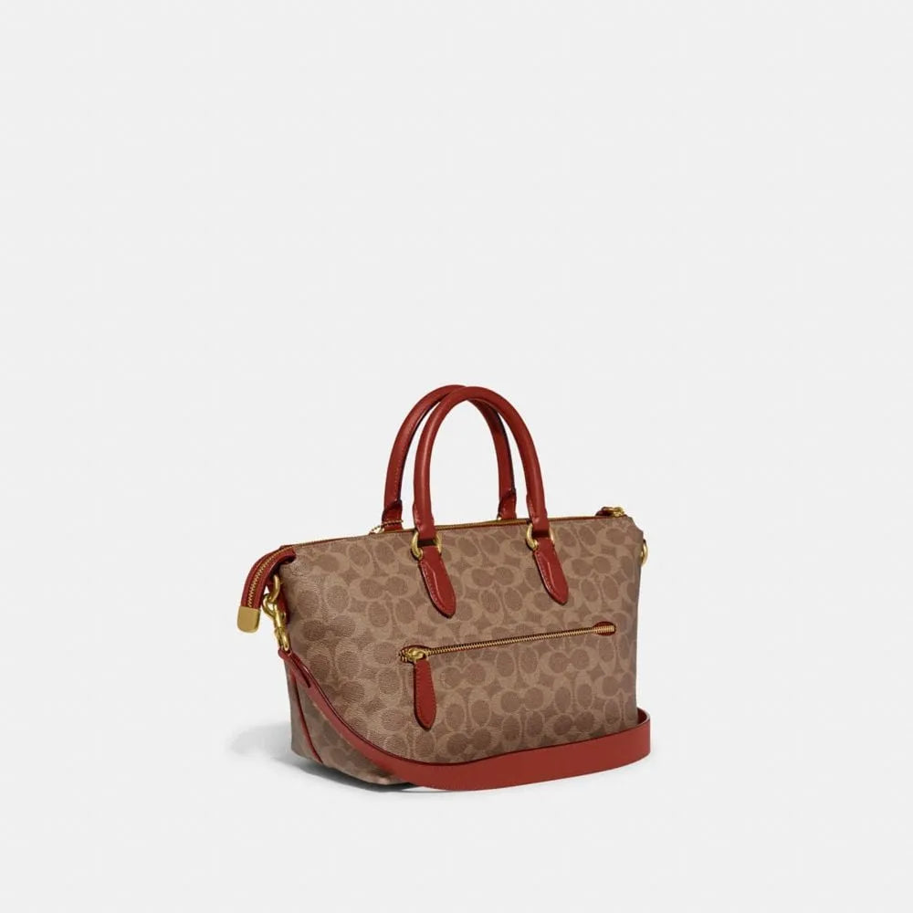 The Cara bag by Coach is a minimalistic modern take on the classic satchel. Crafted in signature coated canvas with luxurious leather trims, this practical style has a roomy interior with multi-function pockets that are easily accessed by opening the elongated zipper.