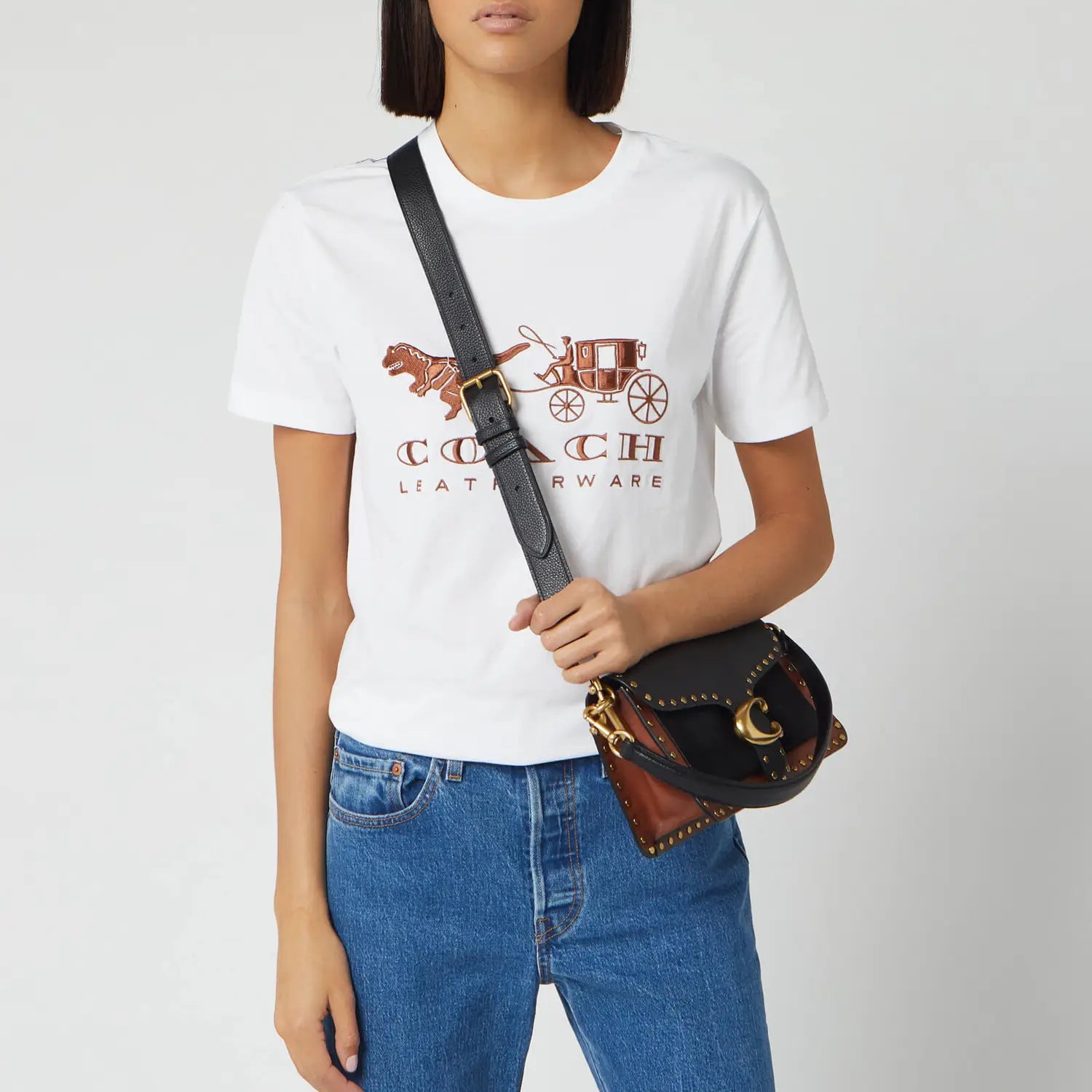 Rectangular shoulder bag by Coach crafted from black pebbled and smooth leather. The bag features a large gold-tone ‘C’ logo and a border of gold-tone rivets to create a Western feel. Offering versatile wear, the bag features a detachable top handle and shoulder strap with gold-tone dog-clip clasps. Finished with a signature Coach luggage tag. The shoulder bag fastens with a press stud closure and features a zipped interior compartment.