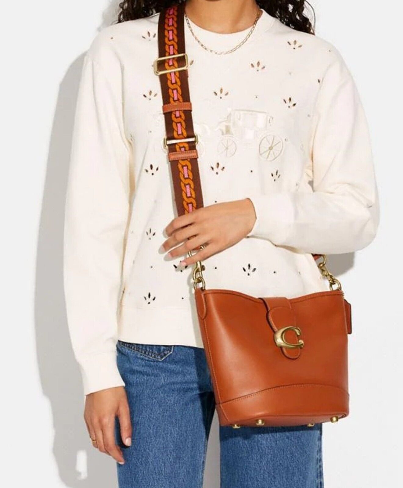 A minimalist style for carrying daily essentials, Coach's bucket bag is crafted from silky smooth black leather and trimmed with signature hardware. It's reinforced with leather trims and opens up to a roomy interior complete with a handy zipped pocket.