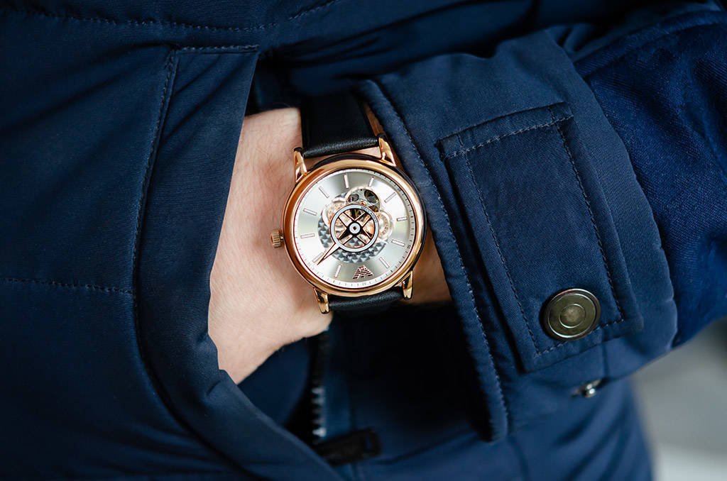 Silver (Skeleton Window) dial enhanced by luminous rose gold-tone hands. Rose Gold-tone stainless steel case with a black leather band. Automatic movement. 50 meters / 165 feet water resistance. Fixed bezel. Scratch Resistant Mineral crystal. Transparent caseback.