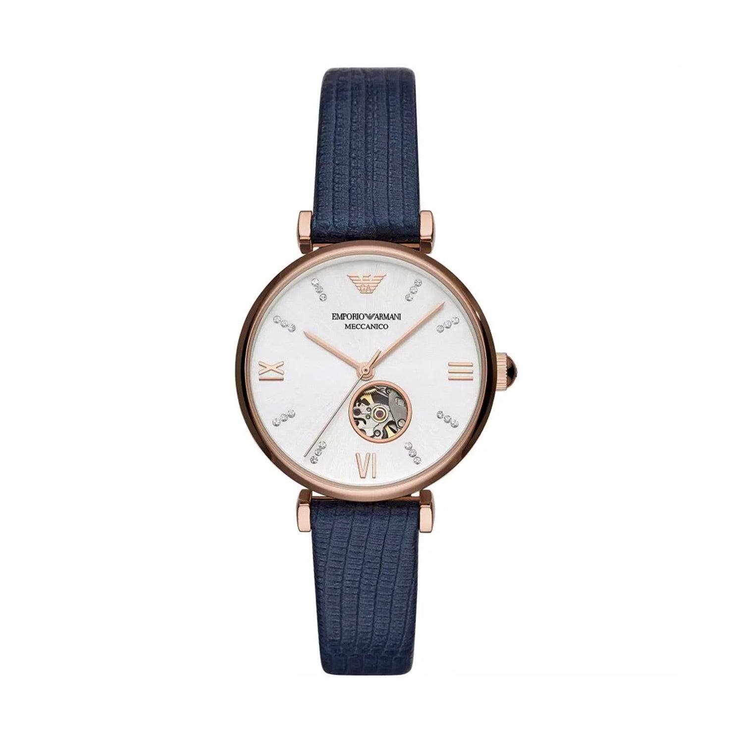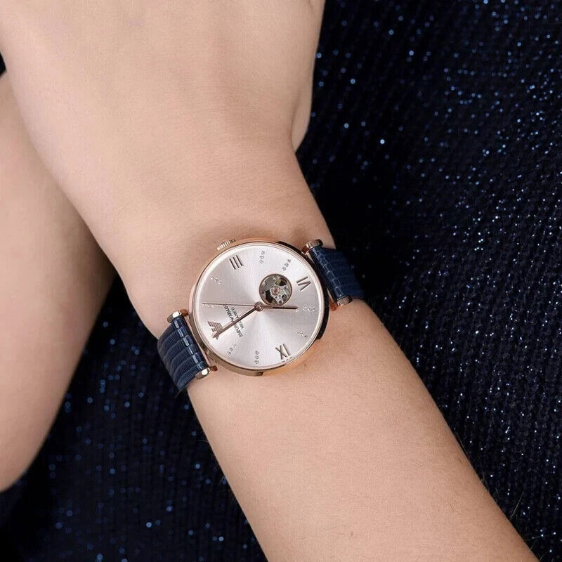 Silver (Skeleton Window) dial enhanced by luminous rose gold-tone hands. Rose Gold-tone stainless steel case with a black leather band. Automatic movement. 50 meters / 165 feet water resistance. Fixed bezel. Scratch Resistant Mineral crystal. Transparent caseback.