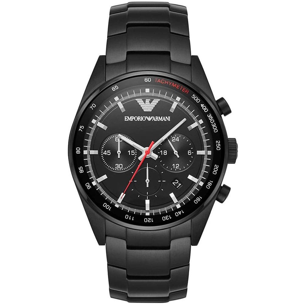 Black ion-plated stainless steel case and bracelet. Fixed black ion-plated bezel. Black dial with silver-tone hands and index hour markers. Minute markers. Tachymeter markings around the outer rim. The Emporio Armani logo appears at the 12 o'clock position. Dial Type: Analog. Luminescent hands and markers. Date display between the 4 and 5 o'clock positions. Chronograph - three sub-dials displaying: 60 second, 60 minute and 24 hour. Quartz movement. Scratch resistant mineral crystal. Solid case back. Case size: 43 mm. Case thickness: 12 mm. Round case shape.
