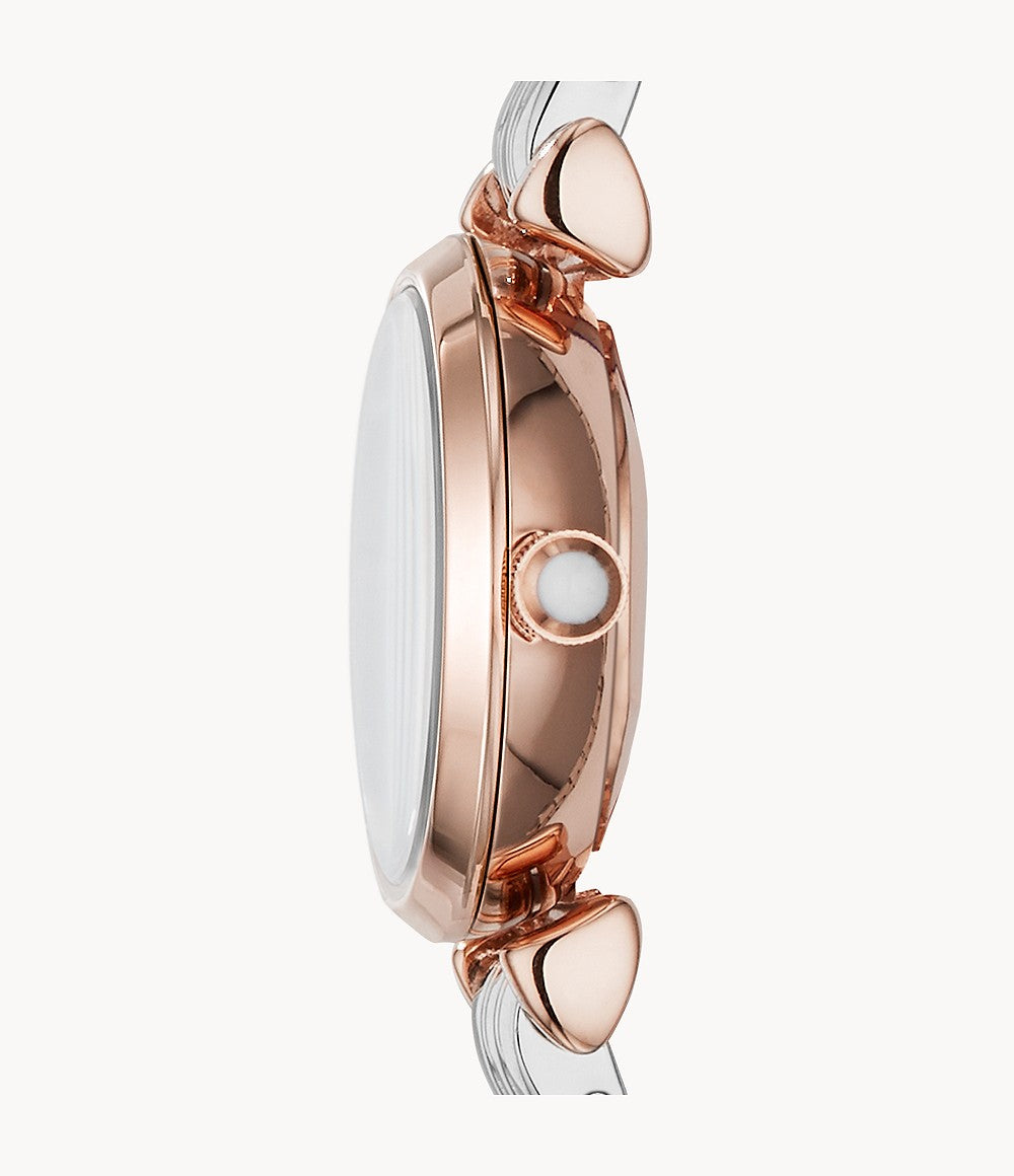 This Emporio Armani ladies’ watch shines with a gold-tone case and slim two-tone, seven-link bracelet. A pave crystal inner dial and gold-tone Roman numeral indexes add a feminine finishing touch.