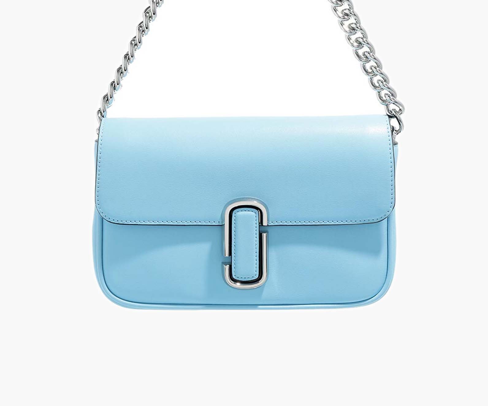 The J Marc Soft shoulder bag from Marc Jacobs featuring blue, leather, silver-tone logo plaque, embossed logo to the rear, foldover top with magnetic fastening, main compartment, internal zip-fastening pocket, internal slip pocket and chain-link shoulder strap.