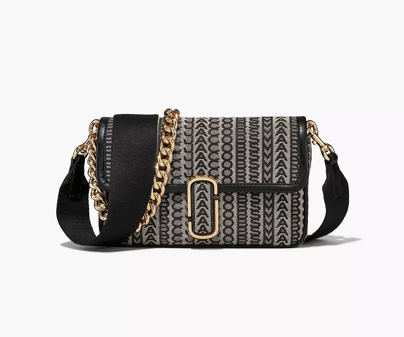 A shoulder bag crafted in monogram jacquard and sealed by the J Marc hardware. With three ways to wear, go from formal to casual by swapping the chain shoulder strap with the webbing crossbody strap, or carry it strapless as a clutch for a true evening moment.
