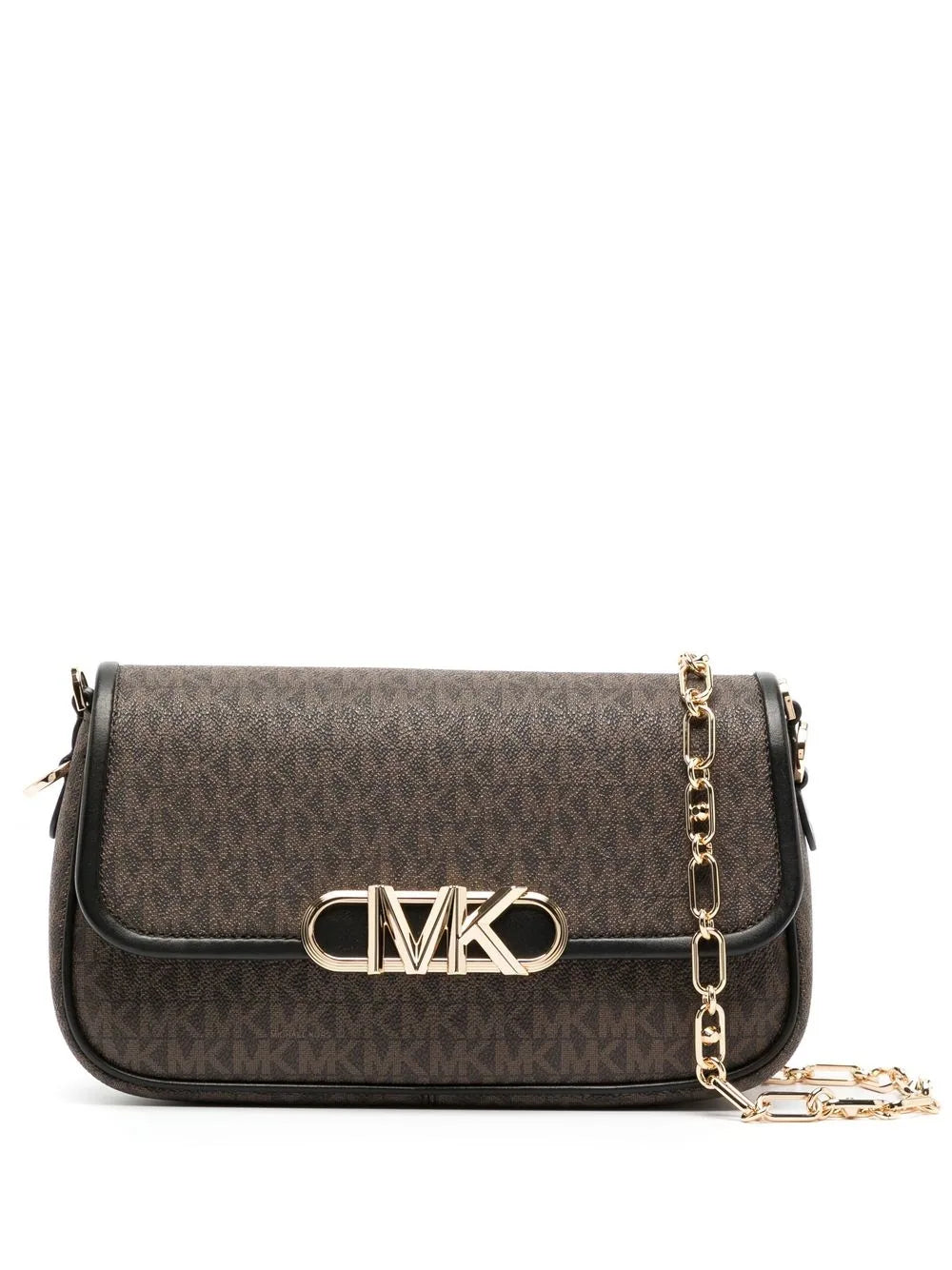 Parker monogram shoulder bag from MICHAEL MICHAEL KORS featuring brown, leather, gold-tone hardware, monogram pattern, foldover top with magnetic fastening, chain-link shoulder strap and main compartment.