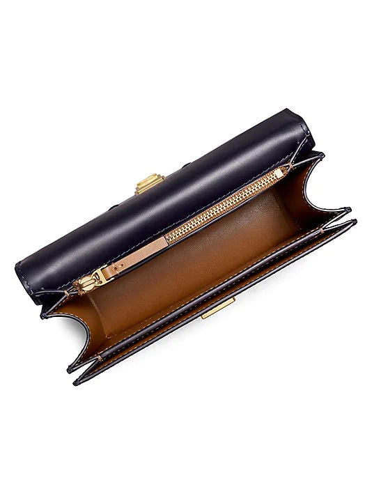 Luxe leather bag featuring an opulent pendant complete with an adjustable goldtone chain.