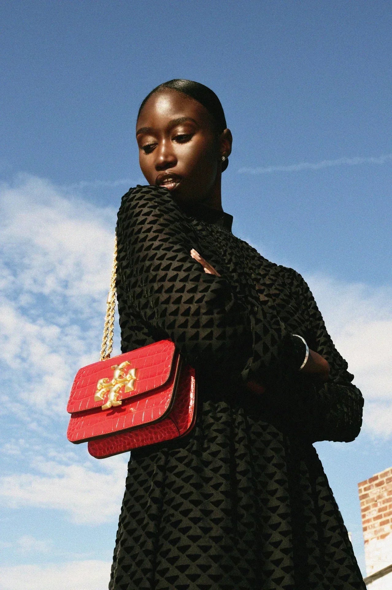 Signature hardware, scaled-up in sculptural brass. The Eleanor Small Bag is a structured shape in croc-embossed Italian leather — with edges that are painted by hand, to emphasize the clean lines. Its twisted rope chain is inspired by jewelry, and is convertible.