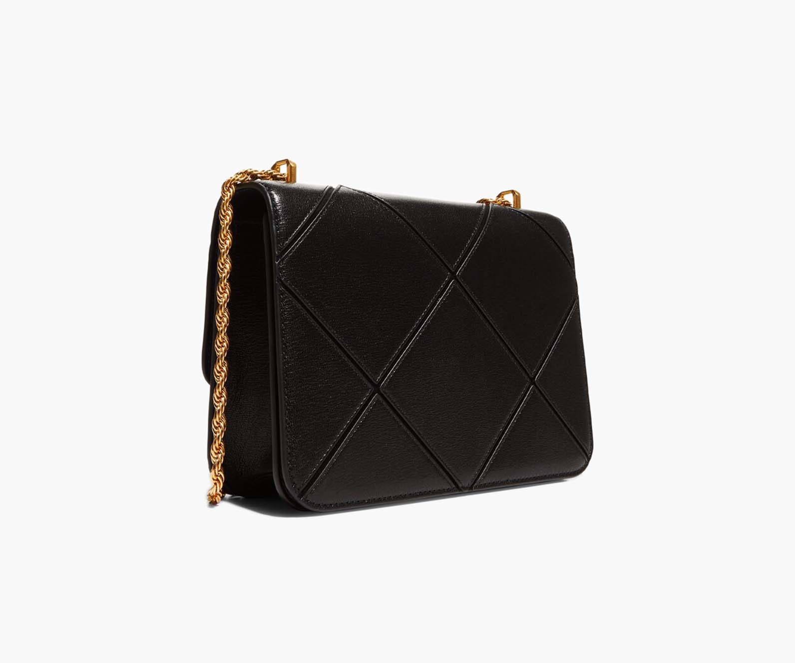 Signature hardware, scaled-up in sculptural brass. The Eleanor Bag puts extraordinary craftsmanship in focus: soft leather is rolled onto a suede underlay and intricately patchworked. The edges are painted by hand, to emphasize the clean lines. Its twisted rope chain is convertible: wear it doubled or long and crossbody.