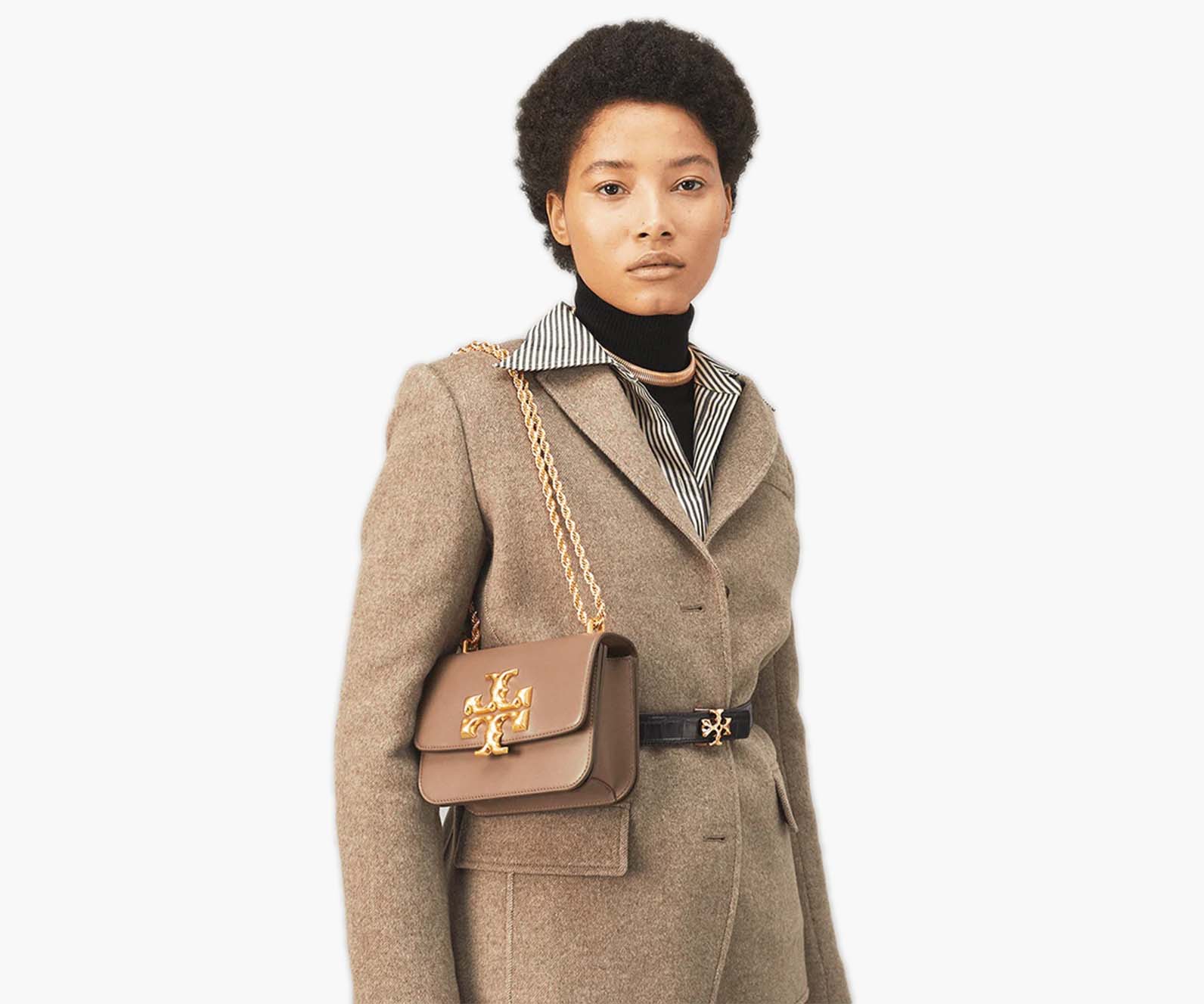 Signature hardware, scaled-up in sculptural brass. The small Eleanor Bag is a structured shape in soft Italian leather — with edges that are painted by hand, to emphasize the clean lines. Its twisted rope chain is convertible: wear it doubled or long and crossbody.