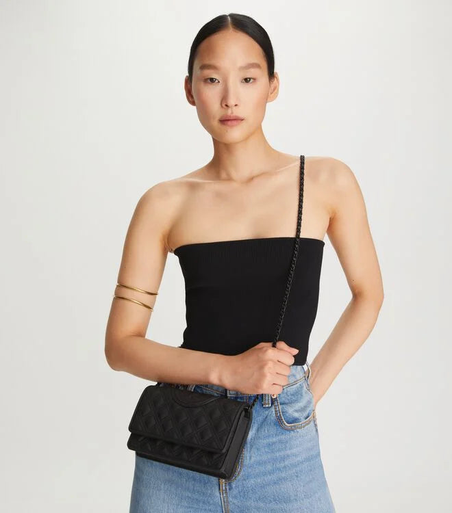 The new Fleming: a matte design with bolder diamond quilting, an embossed bombé Double T and a braided tonal chain strap. Exclusively available at toryburch.com and in our boutiques.