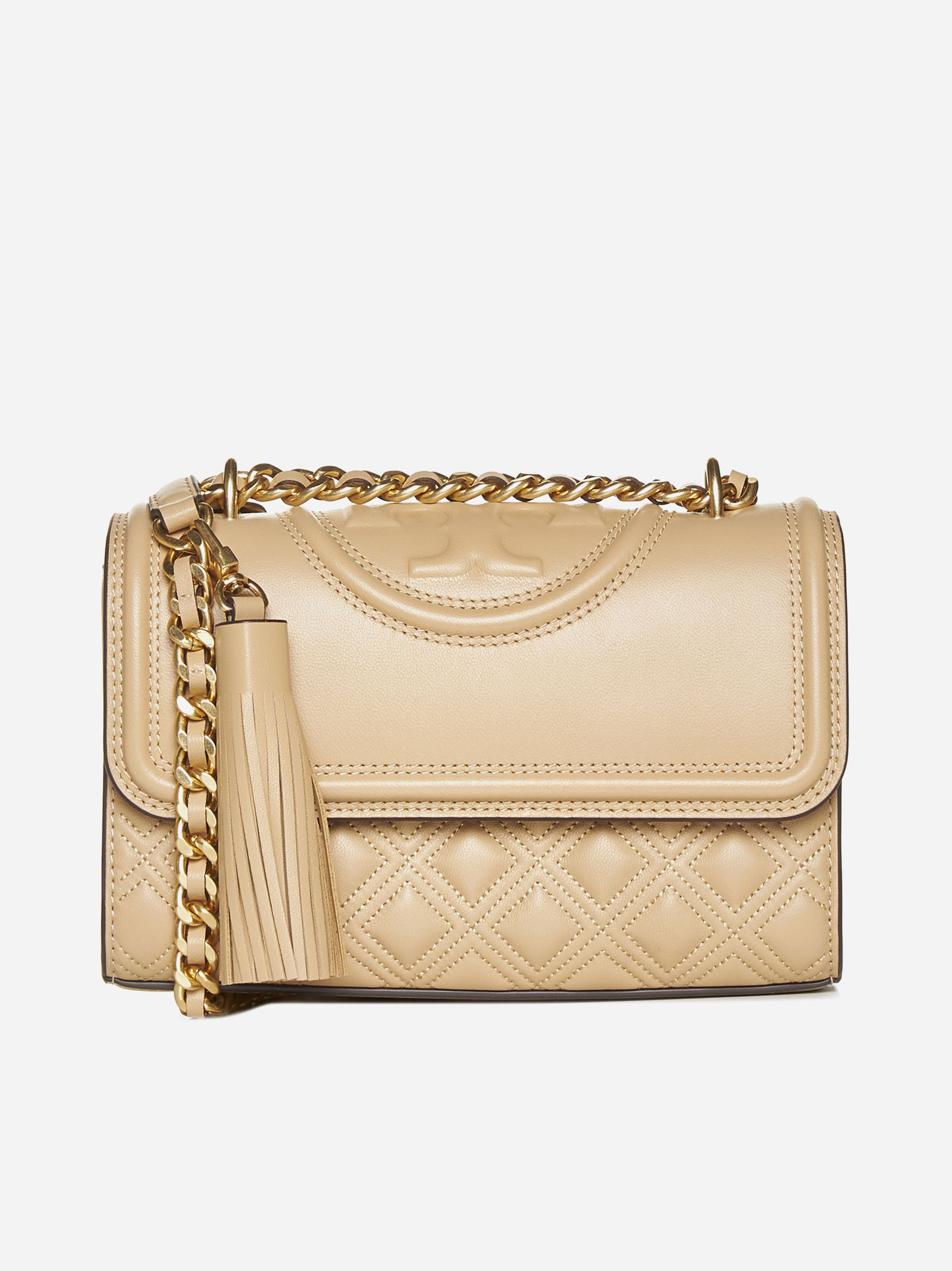 Tory Burch’s Fleming Small Convertible bag in sand-tone diamond quilted leather featuring embossed logo on the cuff, leather and chain shoulder strap, fringed tassel charm, concealed magnetic fastening, internal zip pocket and gold-tone metal hardware.
