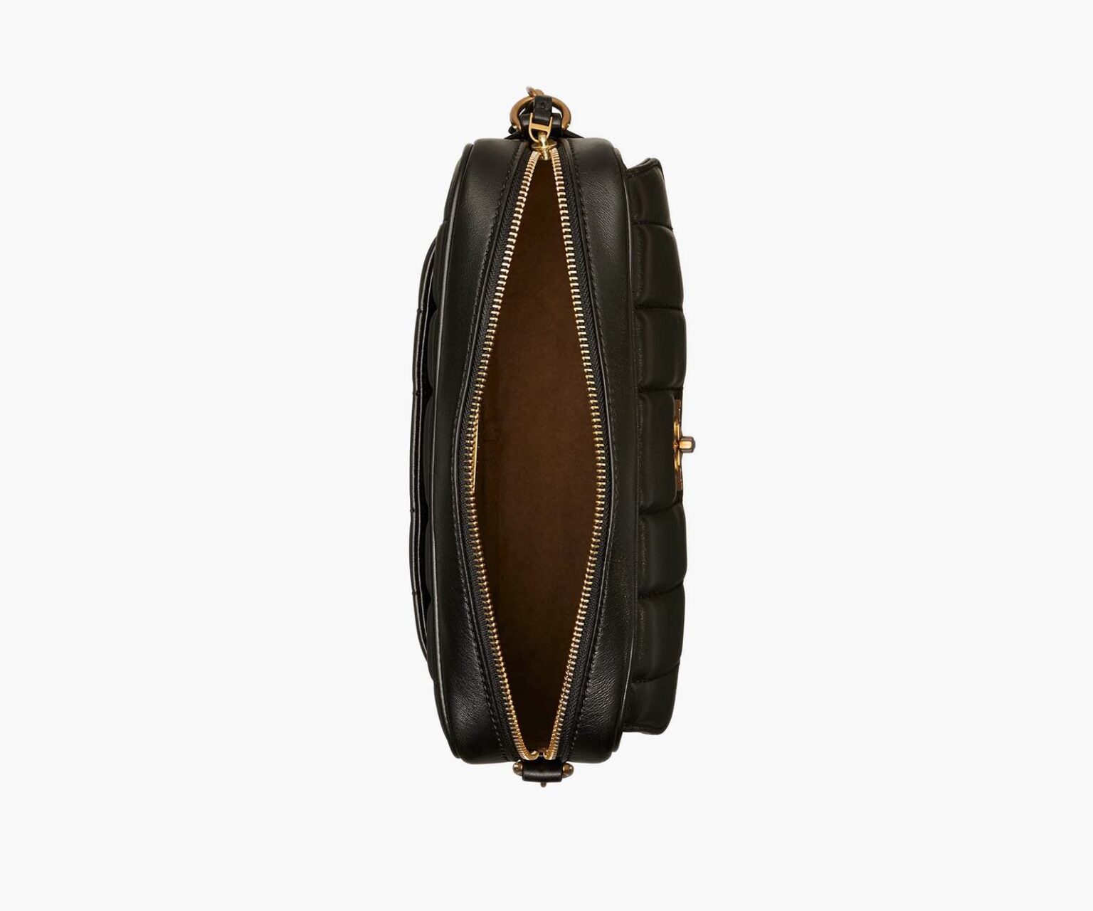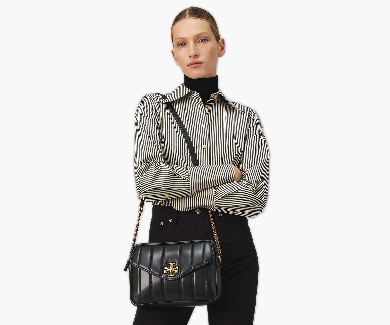 Our Mini Kira Camera Bag with beveled turn-lock hardware. The linear quilting and luxurious leather recall the plush interiors of classic cars. Enduringly chic, it has pockets inside and out, and a chain-accented strap to wear over the shoulder or crossbody.