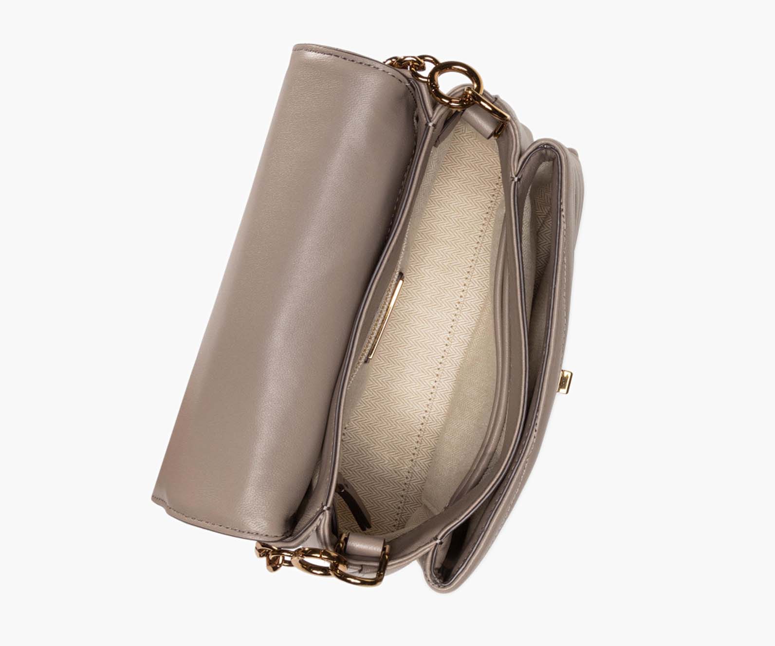 Our double ’T’, as beveled hardware: the Kira Satchel, in soft chevron-quilted leather, has two carrying options: a top handle and an adjustable crossbody strap.