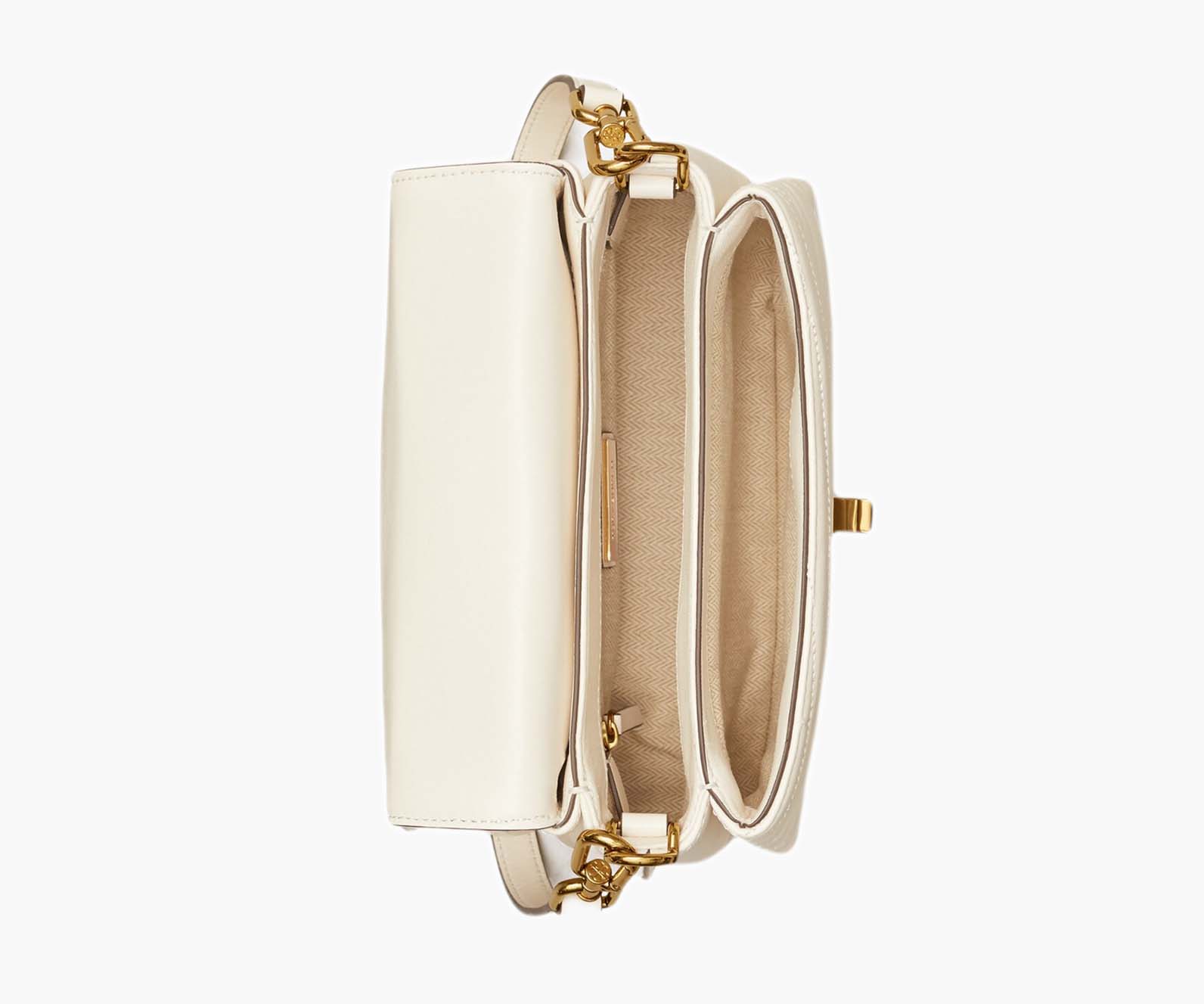 Tory Burch’s ‘Kira’ satchel has a classic, clean-line silhouette and chevron-quilted finish. Crafted from soft lambskin leather, the white bag is constructed with both a top handle and a crossbody strap that can easily be adjusted. The fold-over flap is secured with a turn-lock fasten and opens to reveal three internal compartments, two slip and one zip. On the outer, an exterior slip pocket features. The decorative gold-tone chain can be removed.