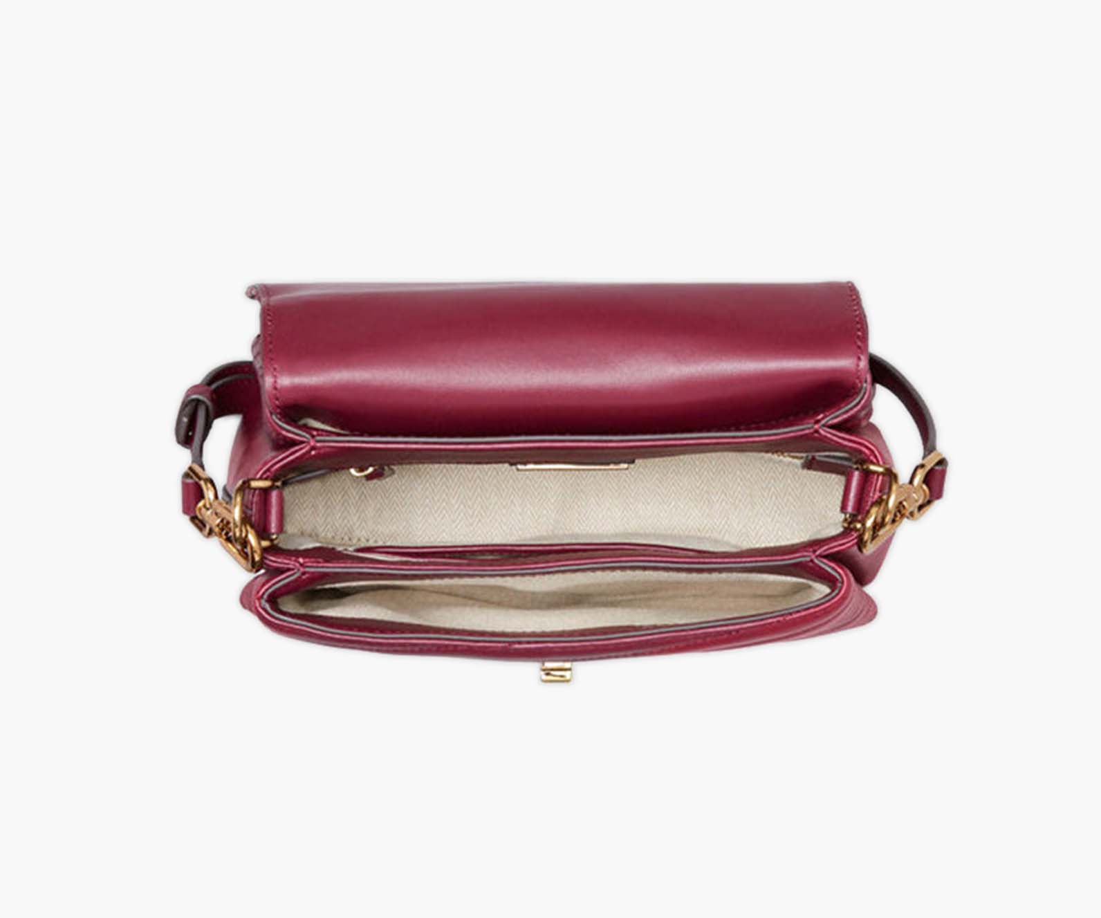 Tory Burch Kira satchel in lambskin leather with gold-tone metal hardware. This satchel features 3 main compartments, 2 slit pockets, 1 zipper pocket, Flap with turnlock closure, and a Adjustable, removable crossbody strap with 22.5" (56.5 cm) drop. Height: 6.6" (16.5 cm); length: 9.6" (24.2 cm); depth: 4.2" (10.5 cm).
