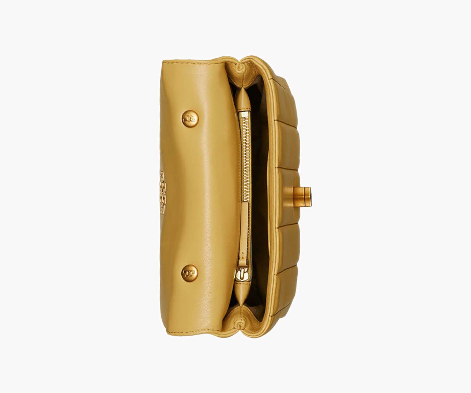 The new Kira Quilted Satchel with our Double T as a graphic turn-lock closure. The linear quilting and luxurious leather recall the plush interiors of classic cars. Enduringly chic, it has an envelope edge and two carrying options: by the top handle or by the chain-accented shoulder strap.