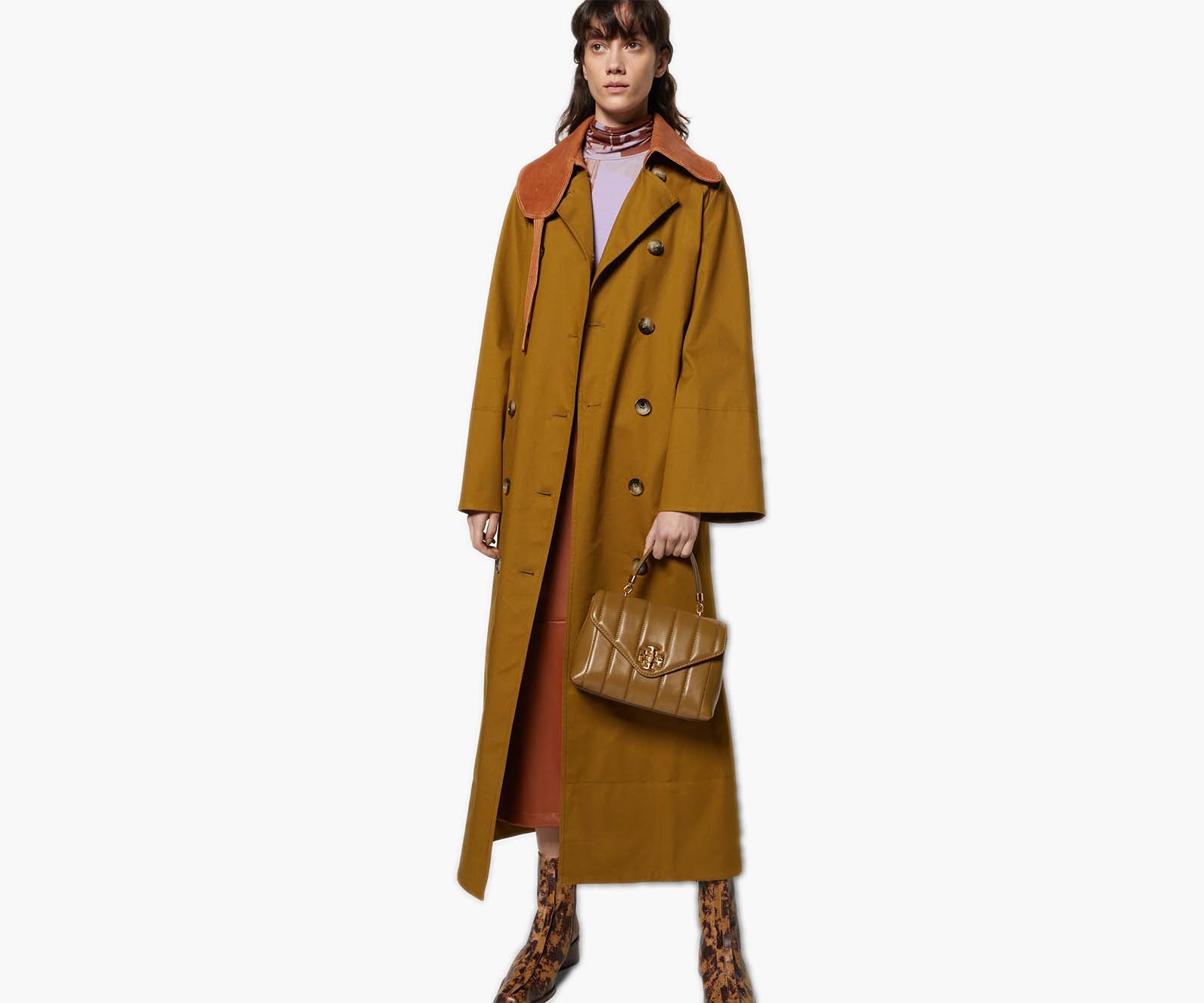 The new Kira Quilted Satchel with our Double T as a graphic turn-lock closure. The linear quilting and luxurious leather recall the plush interiors of classic cars. Enduringly chic, it has an envelope edge and two carrying options: by the top handle or by the chain-accented shoulder strap.