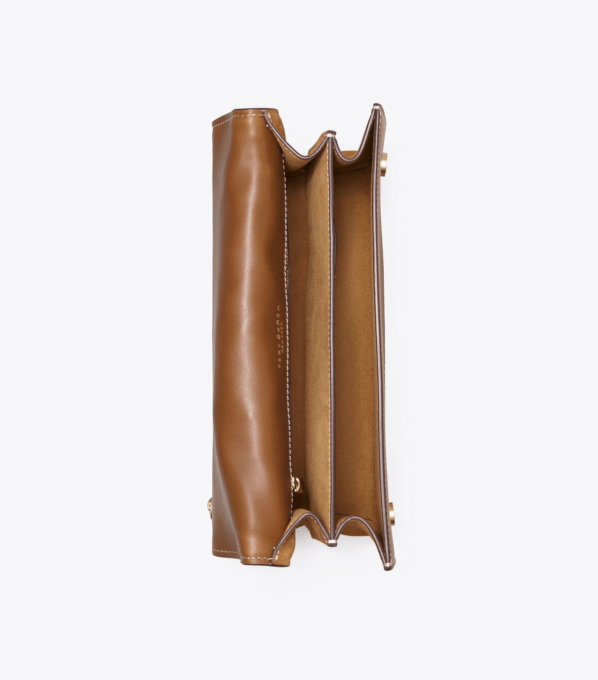 A striking expression of workmanship and artistry. Hand-woven braiding. Artisanal stitching. Natural-grain leather with our signature Double T. The new Miller Shoulder Bag features an intricate basket-weave, inspired by baskets that hung in Tory's childhood farm. It's designed with an adjustable strap and a removable gold chain. The gusseted shape opens to multiple compartments, including a zippered pocket that fits a phone.