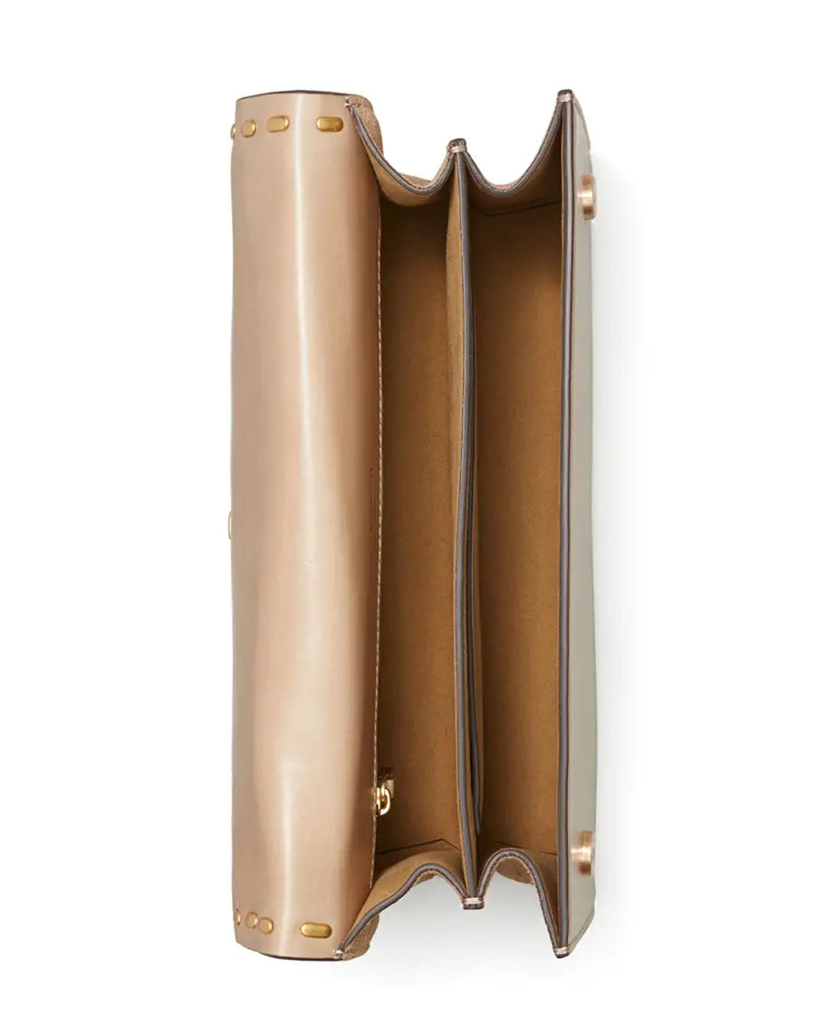 - Brass-finish hardware; stitching throughout