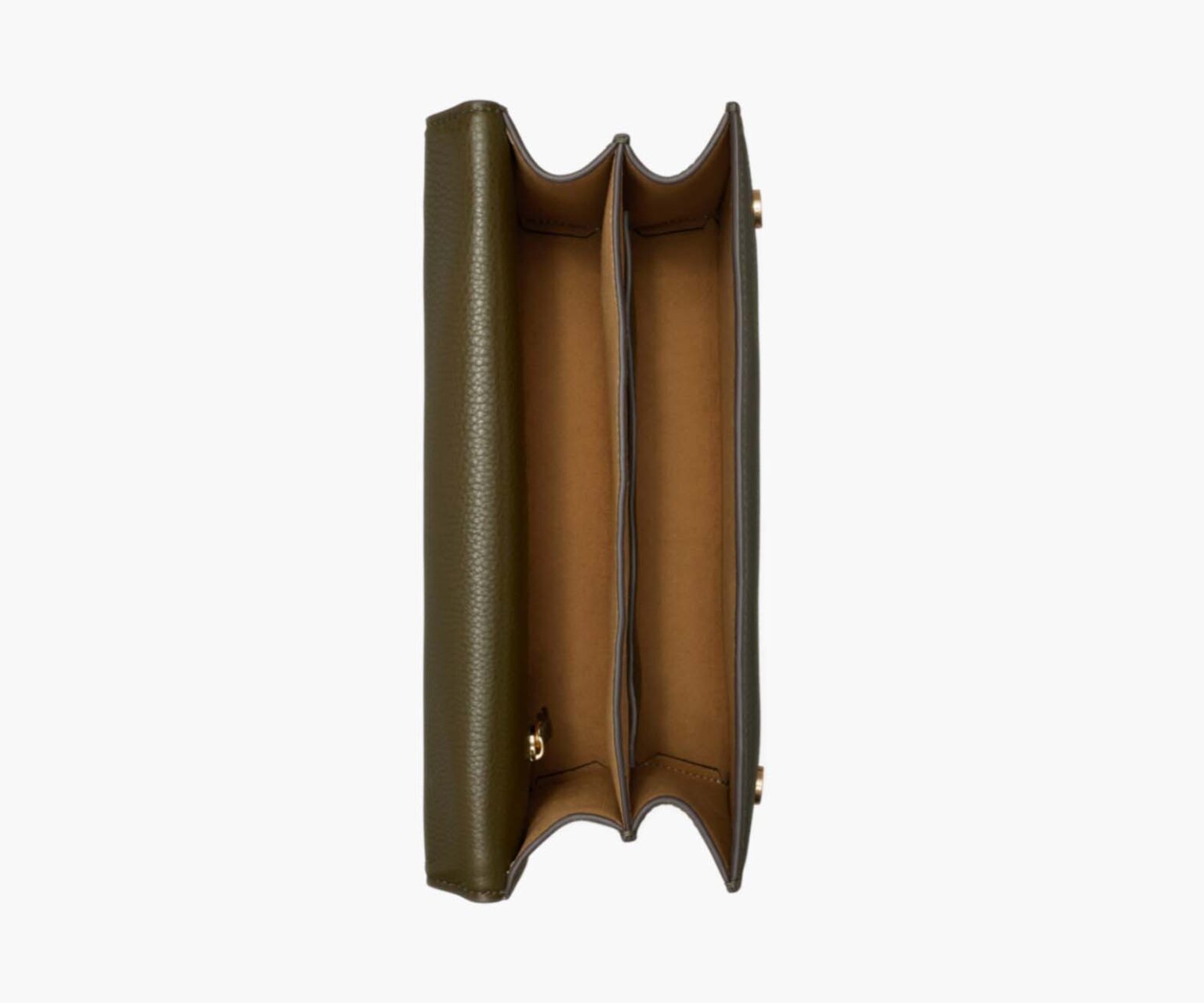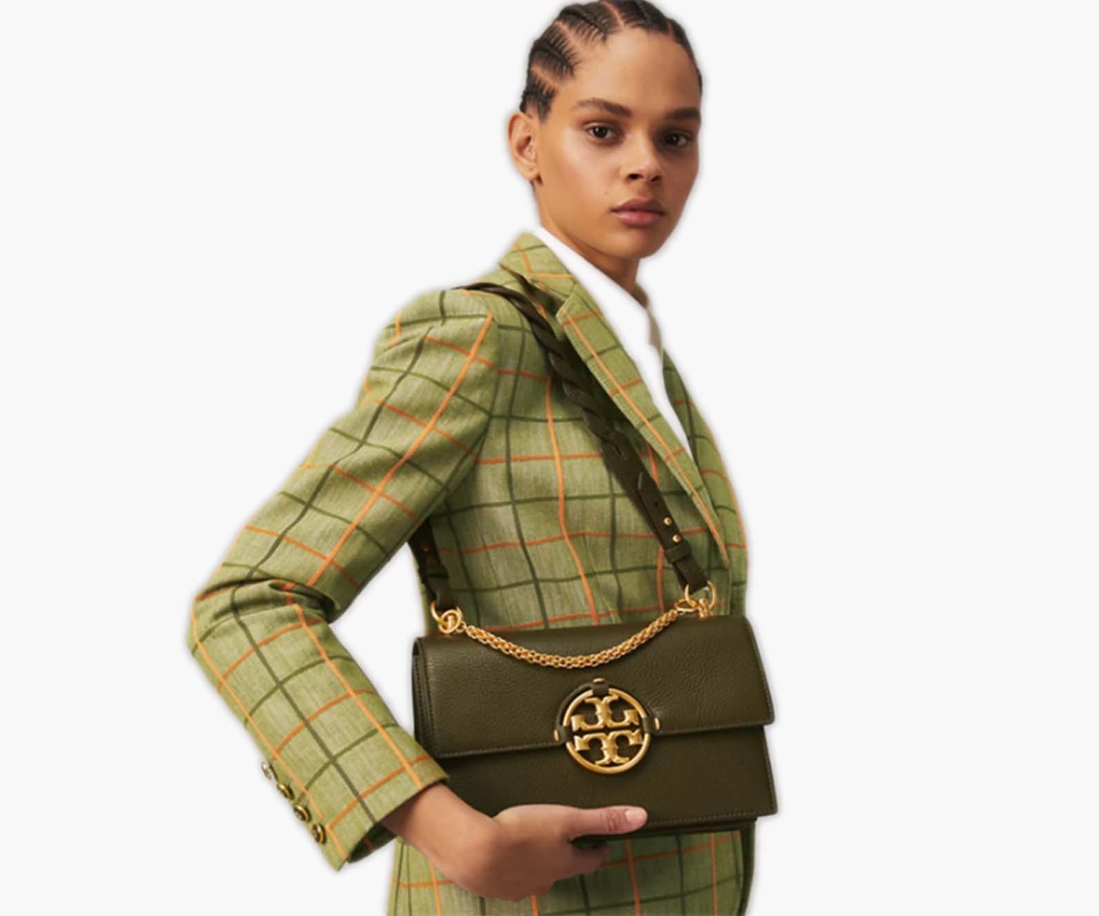A striking expression of workmanship and artistry. Hand-woven braiding. Artisanal stitching. Natural-grain leather with our signature Double T. The new Miller Shoulder Bag is designed with an adjustable strap and a removable gold chain. The gusseted shape opens to multiple compartments, including a zippered pocket that fits a phone.