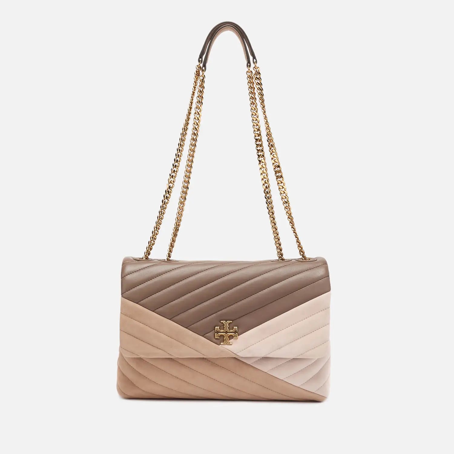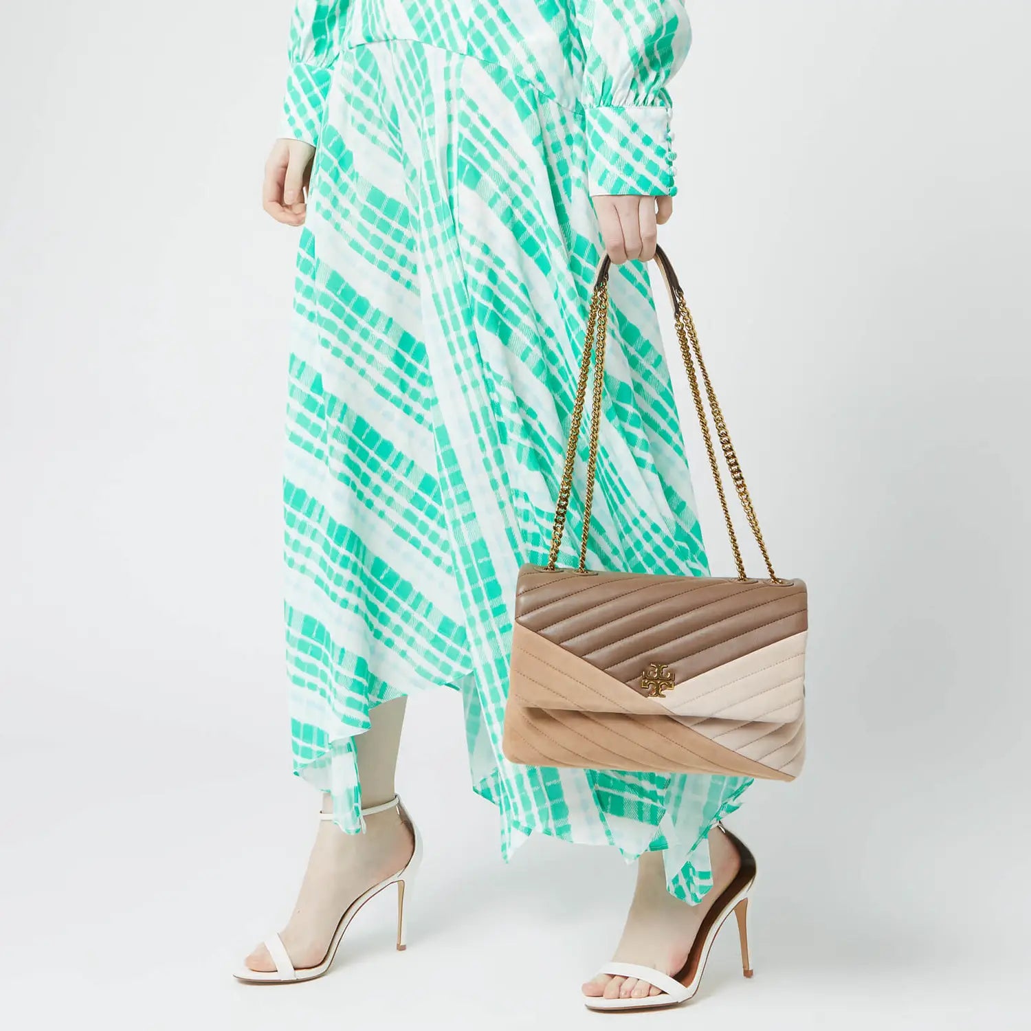 Flap shoulder bag made from softly quilted leather and suede. Stitched chevron design. Magnetic snap fasten flap with an dual interior compartment containing a central zipped section, a zipped pocket and two slip pockets. Adjustable chain and leather blend strap in a convertible style for multiple ways of carrying.